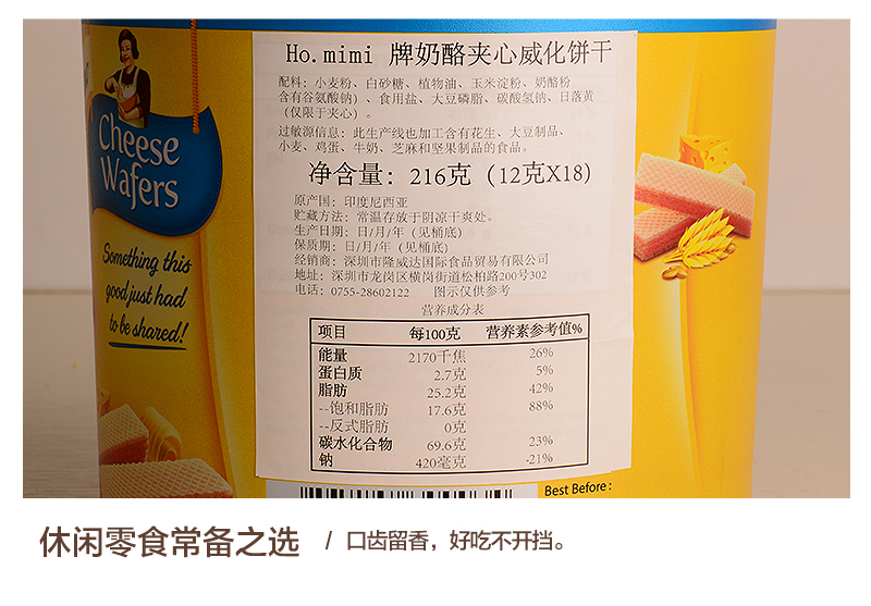 產(chǎn)品描述 推薦產(chǎn)品 HO.mimi牌飛行小圓餅(混合口味) Ho.mimi牌裹衣花生-160g 奶酪?jiàn)A心餅干-360g HO.mimi牌梳打餅干-268g HO.mimi牌蘇打餅干-500g HO.mimi牌消化餅干(400g/罐)