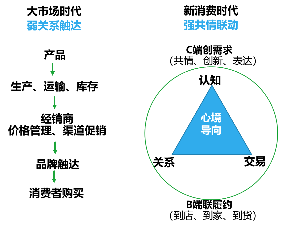 新消費和大市場在商業(yè)模式上存在底層邏輯的天壤之別。大市場時代是產(chǎn)品導(dǎo)向、渠道為王,標準增長公式為國民化大單品+洗腦化大傳播+壓貨式大分銷+流量式大出貨,本質(zhì)商業(yè)邏輯是供給重于需求、貨找人的弱關(guān)系觸達。