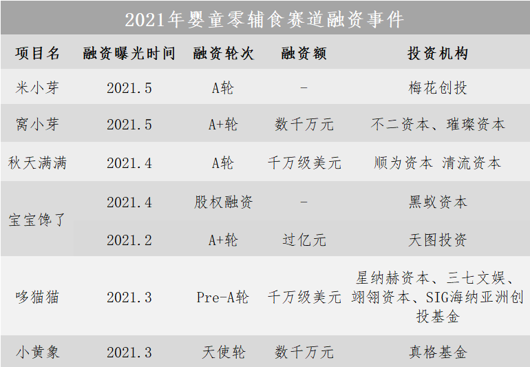 2021年春節(jié)過后的三個(gè)月的時(shí)間內(nèi),這個(gè)賽道至少已經(jīng)發(fā)生了7起融資事件,真格、順為、梅花、天圖、黑蟻、清流等知名機(jī)構(gòu)不斷押注,這個(gè)賽道就是嬰童零輔食。